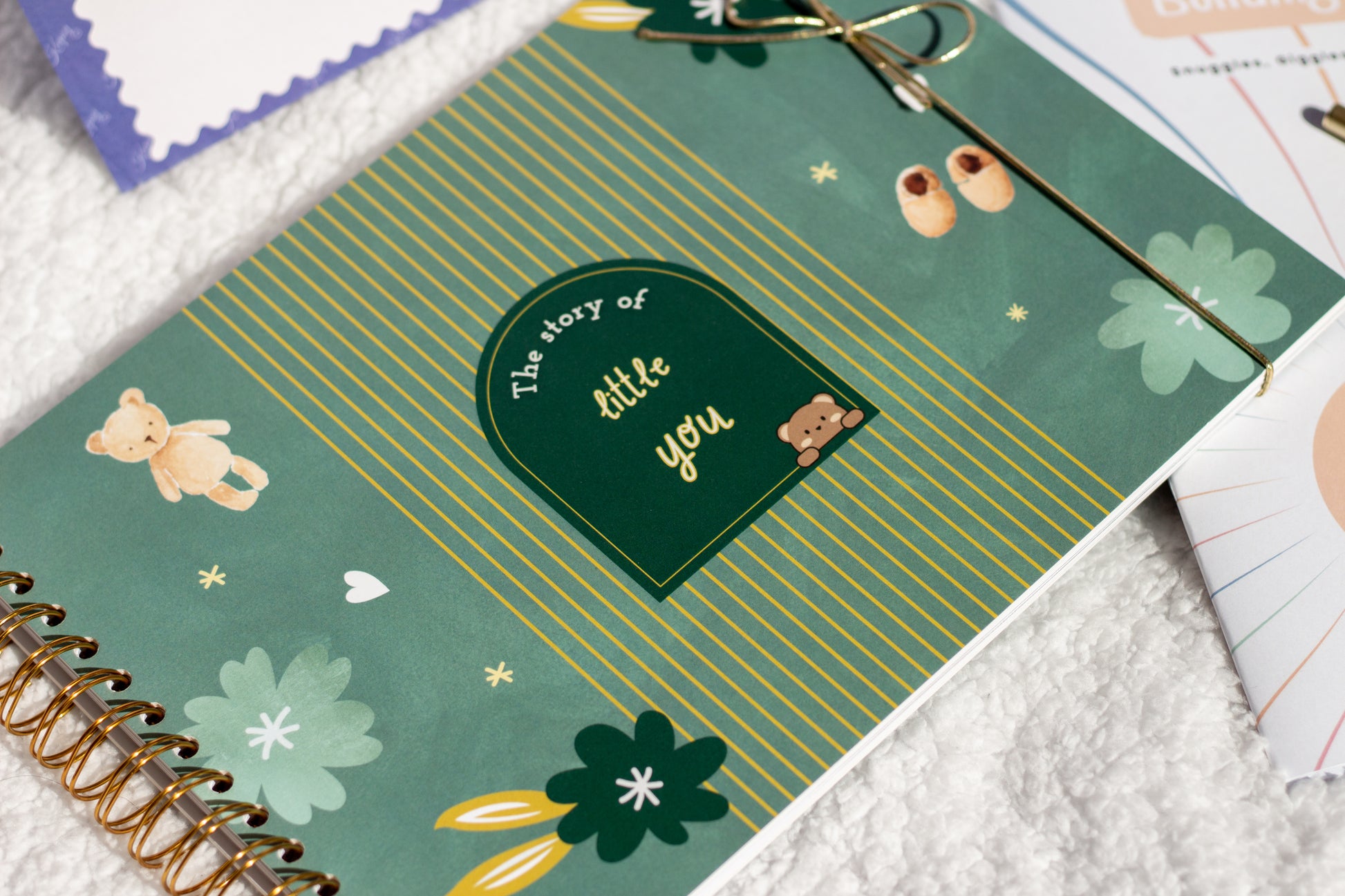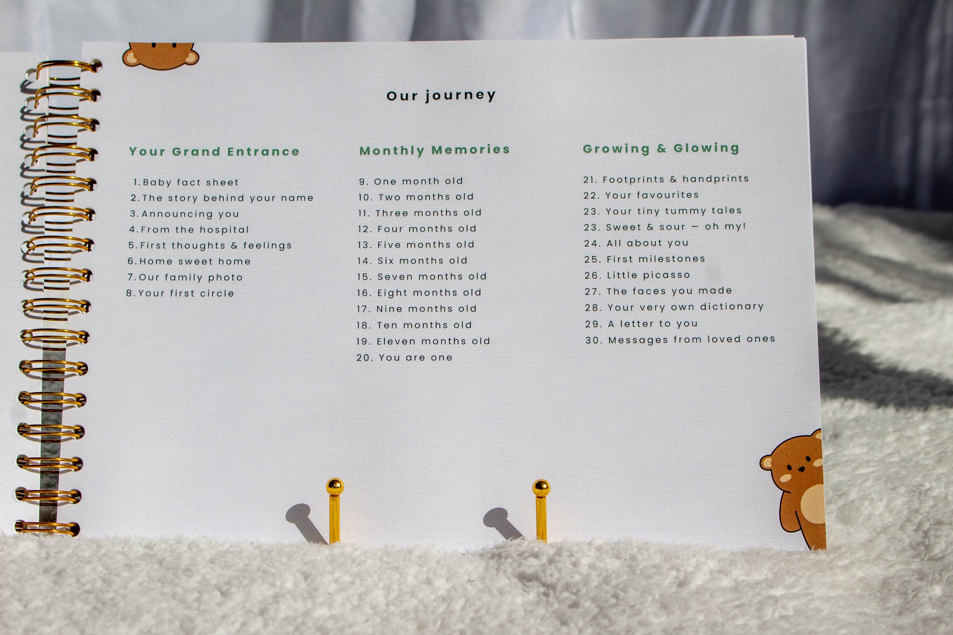 - Baby memory journal – 54 full-colour pages, 30 heartfelt prompts, space for photos, premium gold accents.