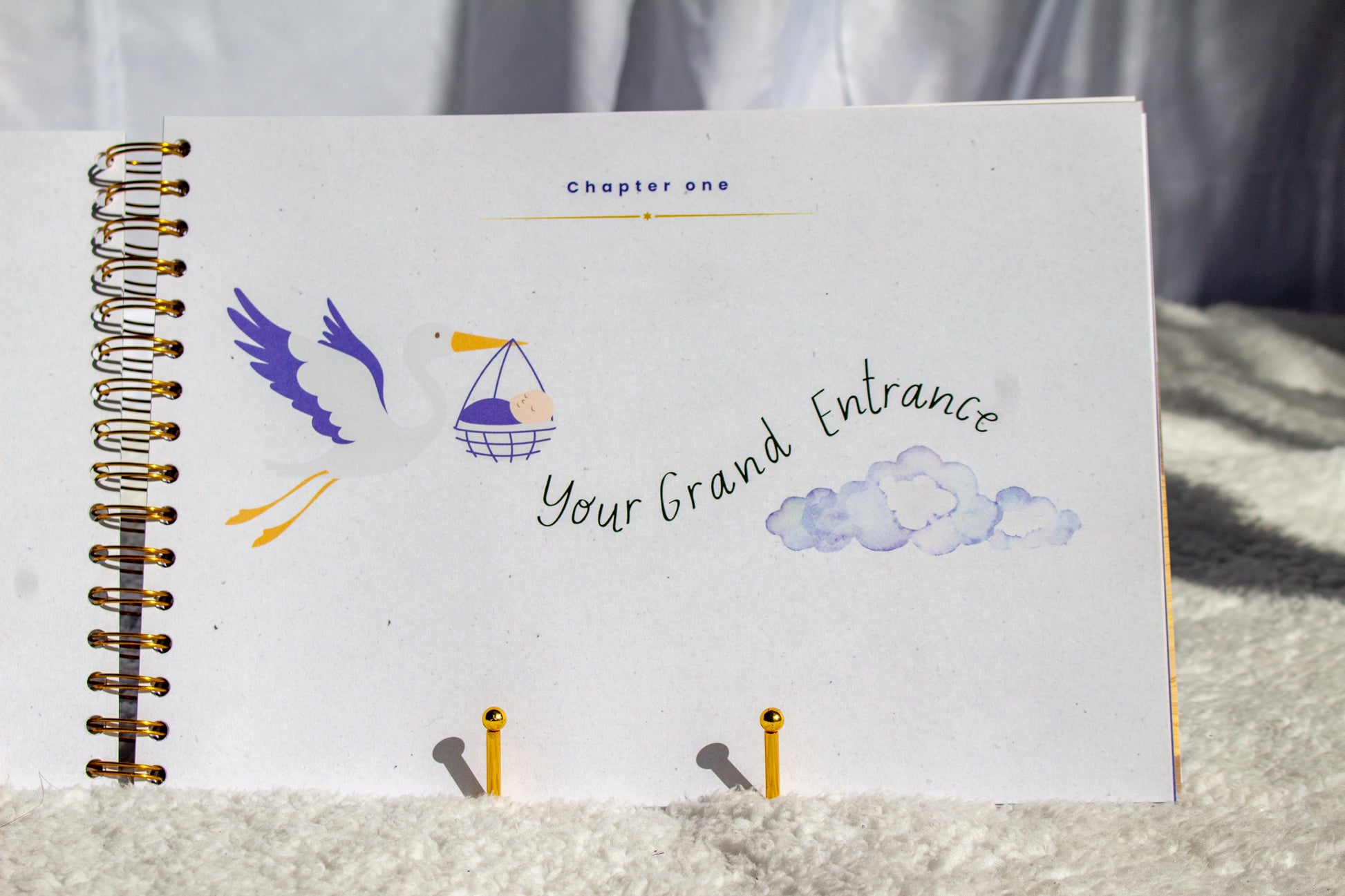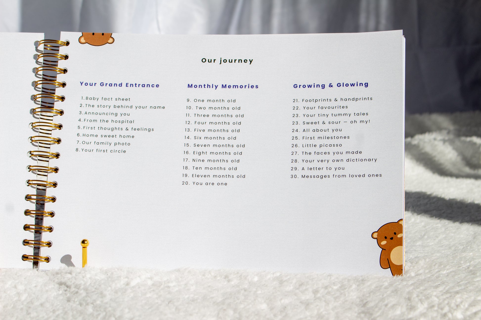- Baby memory journal – 54 full-colour pages, 30 heartfelt prompts, space for photos, premium gold accents.